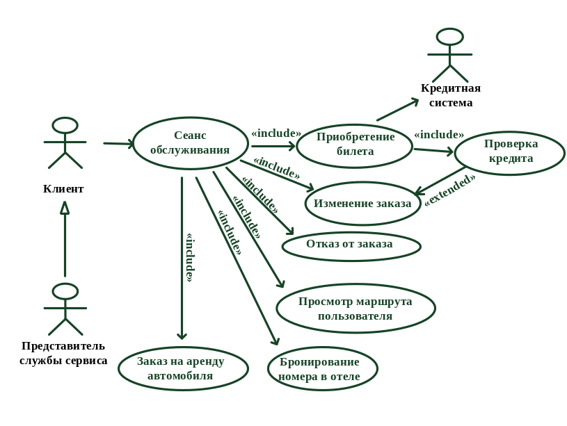 Қолдану варианттарының диаграммасы жүйедегі кейбір әрекет етуші тұлғалардың қолдану варианттарын және олардың арасындағы қарым – қатынасты көрсетеді. Диаграмма жоғары деңгейдегі жүйе сипаттамасын (жүйе архитектурасын) көрсетеді, ескеретін жағдай өңделетін жүйемен қарым – қатынаста болатынның барлығы әрекет етуші тұлға бола алады. Қолдану варианттарының диаграммасына мысал сурет 5.14. көрсетілген. Диаграммада жүйелік әрекет етуші тұлғалар, жүйелік қолдану варианттары және олардың арасындағы қарым – қатынастар көрініп тұр. Берілген жүйе интерактивті және телефон арқылы авиабилет сатушыларға арналған, сондықтан Клиент және Сервис қызметінің қызметкері бірдей қолдану варианттарын инициялизациялай алады. Диаграммада қосылатын және бір кеңейтілетін қарым – қатынас орналасқан. Жүйенің барлық функционалдылығы келесі сегіз қолдану варианттарының жиынтығымен көрсетілген, олар: Билет сатып алу, Тапсырысты өзгерту, Кредитті тексеру, Тапсырыстан бас тарту, Пайдаланушы маршрутын қарау, Қонақ үйден нөмір брондау, Автокөлік арендасына тапсырыс беру және Авиа рейстер кестесін орнату.
