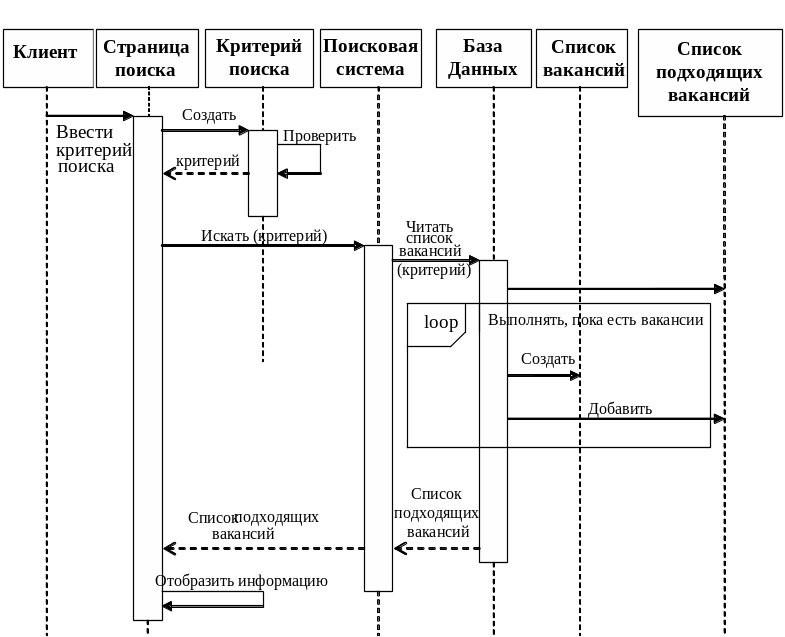 Бұл суретте клиент (іздеушілер), іздеу беті және іздеу жүйесі бар. Клиентпен енгізілген ақпараттарды жіберу, тексеру және сақтау үшін ІздеуКритериі параметрлік объектісін қолданамыз. Диаграммада іздеу жүйесі деректер қорындағы (бұл этапта ДеректерҚоры обьектісі деректерге қатынау интерфейсі ретінде қолданылады) вакациялар жайындағы ақпараттарды оқуды бейнелейді, сонымен қатар бұл объект оқылған ақпараттарды ТабылғанВакацияларТізімі обьектісіне орналастырады. Алынған диаграмманы ең төменгі бірмәнділік емес деңгейімен таратуға болады.