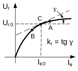 На характеристике отмечается рабочая точка с координатами (Iв0, Uг0), которые соответствуют нулевым начальным условиям. Через эту точку проводится касательная к криволинейной характеристике генератора. Тангенс угла наклона данной касательной и будет являться коэффициентом передачи якоря генератора.