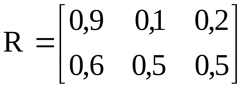 Задача 3.5. Менеджер полагает, что такие показатели (yi) динамики экономики региона как изменения национального дохода, объёма инвестиций и числа выпускаемых специалистов в основном определяется двумя факторами - вариациями доходов и расходов населения (xi). Ему необходимо выделить доминирующий из них. Представительных статистических данных нет, но обработка решений экспертов позволила менеджеру получить матрицу (R) причинных нечётких отношений xi yi :