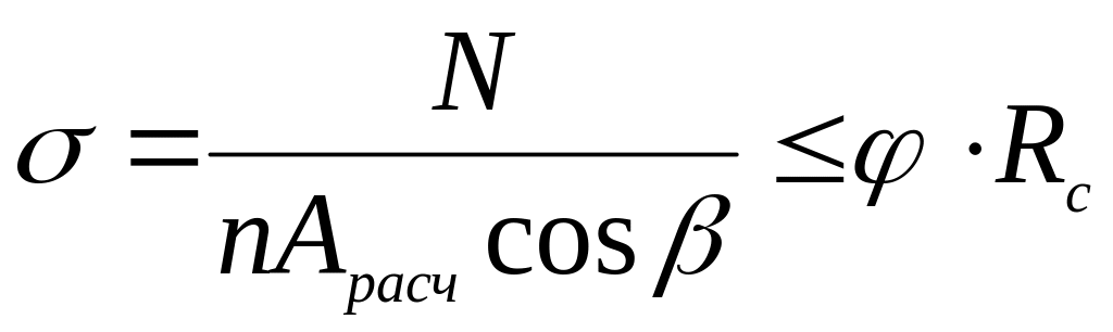 Арасч - расчетная площадь поперечного сечения одной стойки, принимаемая при ослаблениях, не превышающих 25% сечения, равной Абр (брутто), при ослаблениях более 25%, но не выходящих на кромки сечения - 4/3Ант (нетто), при симметричных ослаблениях, выходящих на кромки – Ант;