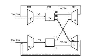система з непрямим керуванням. Вся інформація про потрібне з’єднання поступає і запам’ятовується в загальному пристрої, що наз. Регістром (рис.). Потім, після того, як вся інформація чи частина її, що дозволяє розпочати встановлення з’єднання, накопичена, регістр починає встановлювати прилади з’єднувального тракту, передаючи їм відповідні команди.