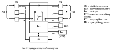 КП – комутаційне поле, що забезпечує з’єднання вхідних та вихідних ліній на час передачі інформації.