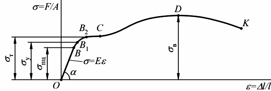 σв – предел прочности (или временное сопротивление разрыву) – максимальное напряжение, которое может выдержать образец без разрушения.