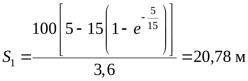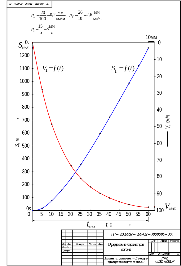 Для построения графиков V1= f(t) и S1= f(t) выполним расчет для значений времени t от 5 до 60 с (с интервалом t = 5 c). При определении параметров обгона графоаналитическим методом расчет V1= f(t) и S1= f(t) может производиться при значениях t и больше чем 60 с, вследствие длительного временного интервала, необходимого для завершения обгона, возможные причины чего – небольшая разница между Vmax ТС1 и V2 ТС2 перед началом обгона, неудовлетворительная динамичность ТС1.