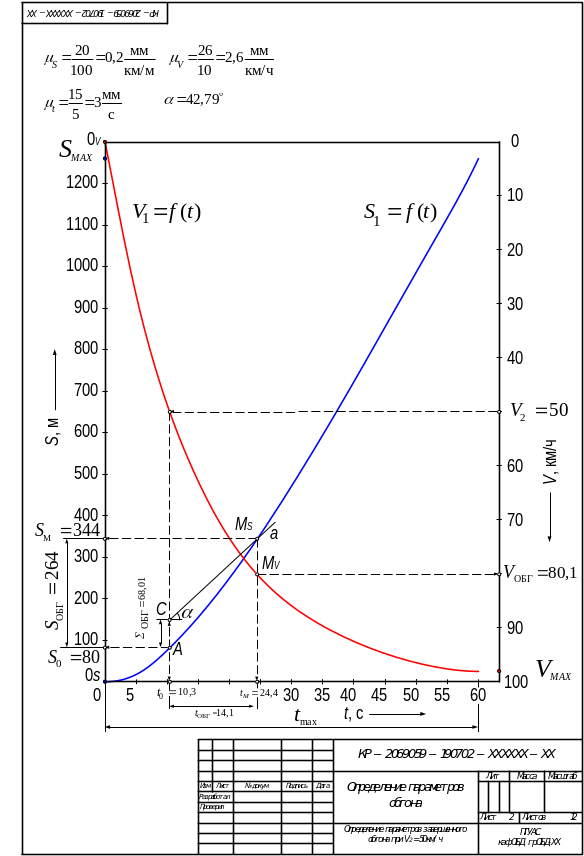 Опустив из точки МS перпендикуляры к осям абсцисс и ординат находим значения времени tM и пути SM, которые равны: tМ = 24,4 с, SМ = 344 м.
