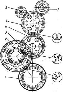 Рисунок 2.6 Установка шестерен привода агрегатов: 1 - шестерня ведущая; 2,3 -- шестерни промежуточные; 4-шестерня распределительного вала; 5-шестерня привода топливного насоса; 6-шестерня привода насоса усилительного механизма; 7-шестерня привода компрессора |