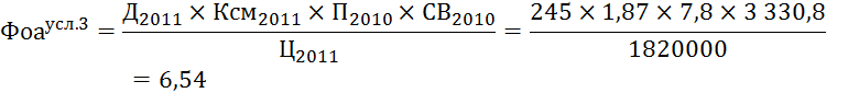 Для определения первого условного показателя фондоотдачи надо вместо среднегодовой стоимости единицы оборудования в 2011 году взять это значение в 2012г.: