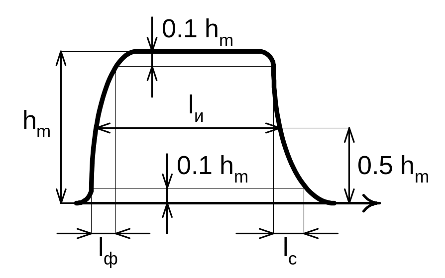 Зарисовать осциллограммы обоих импульсов и измерить их вертикальные и горизонтальные размеры - hm, lи, lф , lс (дел.) (рис.2).