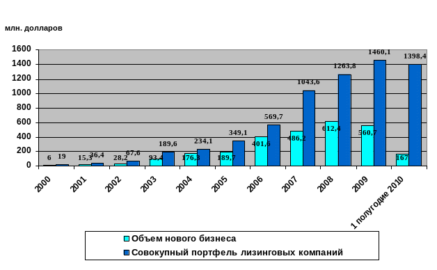 Как видно, основной прирост портфеля приходится на период с 2006 по 2008 годы: совокупный объем лизинговых сделок по итогам каждого из этих годов практически удваивался. Объем вновь заключенных сделок также пропорционально увеличивался, превысив в 2008 году отметку в 600 млн долларов. В то же время примечателен рост портфеля по итогам кризисного 2009 года, а именно: увеличение совокупного объема сделок отечественных лизинговых компаний на 15,6% в долларовом выражении на фоне резкого сокращения деловой активности в стране, снижения объемов кредитования экономики банками второго уровня на 30% и осуществленной девальвации национальной валюты.