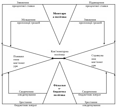 Механізм взаємозв'язку монетарної та фіскальної політики як складових кон'юнктурної (в межах загальноекономічної) політики можна простежити на такій схемі: