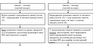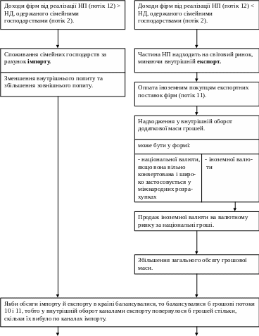 Обидва ці потоки, балансуючи оборот грошей у поточному відтворювальному циклі, містять у собі загрозу порушення балансу в наступному циклі. Такі порушення можуть виникнути як унаслідок зміни обсягів виробленого ВНП, так і зміни співвідношення між обсягами експорту та імпорту.