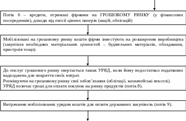 - додаткова кредитна емісія, завдяки якій фірми та уряд зможуть мобілізувати на грошовому ринку (потоки 6 та 8) більше грошей, ніж туди надійде за потоком заощаджень сімейних господарств (потік 5) |