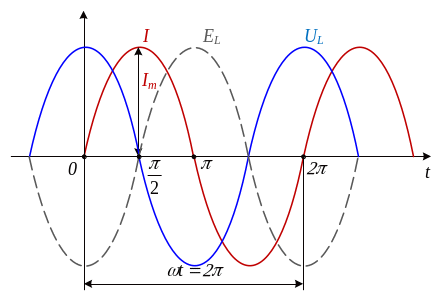 На диаграмме видно, что вектор тока, протекающий через индуктивный элемент, отстает от вектора напряжения на нём (считая, что векторы вращаются против часовой стрелки).