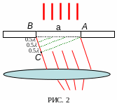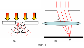 Согласно принципу Гюйгенса каждая точка фронта волны в щели является источником вторичных сферических волн и посылает лучи во всех возможных направлениях (Рис. 1a). Поставим на пути лучей собирающую линзу и в ее фокальной плоскости поместим экран (Рис. 1b). В каждой точке этого экрана будут складываться вторичные волны от щели, прошедшие линзу, и на экране возникает дифракционная картина.