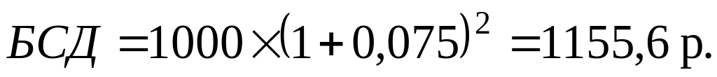 Для нашего примера годовой банковский процент составляет 15 %, а при начислении процентов один раз в полугодие банковская ставка составит 15 : 2 = 7,5 % за полугодие. В этом случае будущая стоимость денег составит: