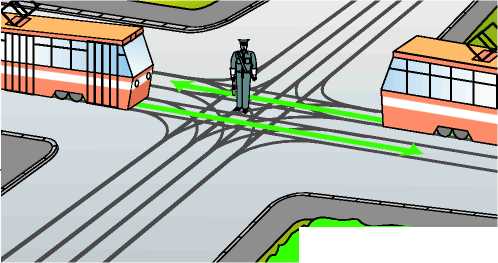 • трамваю разрешается движение - только налево, так как трамваи всегда должны двигаться строго по оси, которую образует тело регулировщика, даже если она согнута.