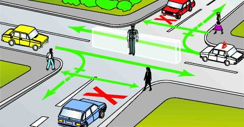 Ведь та ось, которая помогла нам разобраться с предыдущими позициями регулировщика, теперь уходит в небо! И поскольку машины летать пока не умеют, то вывод будет очень простой: со всех четырех сторон перекрестка для всех видов транспорта и пешеходов - движение запрещено.
