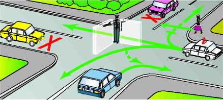 А также не забудьте уступить пешеходам, если Вы собираетесь повернуть направо. Они сейчас имеют право переходить дорогу за спиной у регулировщика.