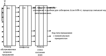 Затем эти запросы, подлежащие обслуживанию, проходят через схему кодирования (CD) и поступают в младшие разряды регистра слова состояния (SW – Status Word) в виде двоичного кода типа прерывания, который должен обслуживаться в данный момент. При этом, шифратор осуществляет анализ всех подлежащих обслуживанию запросов прерываний по их заранее заданным приоритетам, формируя на выходе код типа наиболее приоритетного прерывания (при 8 входах запросов прерываний – 3-х разрядный двоичный код). В старшем разряде регистра слова состояния SW фиксируется наличие хотя бы одного запроса прерывания в системе, в виде установления этого разряда в состояние 1 и выдачи сигнала наличия прерывания – INTR (Interrupt).