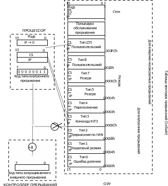 И в том и в другом случае всего определено 256 типов прерываний и, следовательно, любое возможное прерывание определяется 8-ми разрядным двоичным кодом типа прерывания.