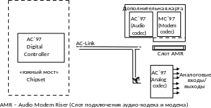 В соответствии со спецификацией АС`97 в звуковой системе функции обработки аналоговых и цифровых сигналов разделены между двумя устройствами: звуковым кодеком (АС`97) – аналоговой микросхемой ввода/вывода – и цифровым контроллером (Digital Controller АС`97). Соединяются эти устройства с помощью специального цифрового интерфейса АС-Link. На материнских платах современных PC цифровой контроллер аудиосистемы включен в состав «южного моста» Chipset, а кодек АС`97 представляет собой микросхему в 48-выводном корпусе с унифицированным назначением выводов. Эта микросхема выполняет аналого-цифровые и цифро-аналоговые преобразования, микширование, аналоговый ввод и вывод сигналов для аудиосистемы и модема. Он также выполняет необходимые преобразования частот дискретизации.