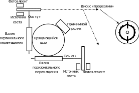 При перемещении мыши по коврику, шарик, который через небольшое отверстие соприкасается с ковриком, - вращается и передает вращение через валики дискам с прорезями. Прорези в дисках модулируют световой поток, вызывая последовательность электрических импульсов от фотоприемников, которые поступают в микроконтроллер. На каждой координате используются по две оптопары (светодиод – фотодиод) и, следовательно, от каждой координаты в микроконтроллер поступают по две последовательности импульсов. По порядку засвечивания фотодиодов микропроцессор определяет направление вращения, а пройденное расстояние рассчитывается по количеству импульсов, полученных от фотодиодов.
