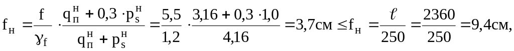 Проверяем условия жесткости исходя из эстетико-психологического требования. Прогиб вычисляется от нормативной постоянной и длительной нагрузок (qпн + 0,3 рsн)