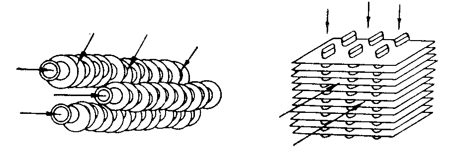 В пластинчатых теплообменниках каналы образуются стенками, разграничивающими теплоносители, и поперечными перегородками (см. рис. 12.2, б). Форма поперечного сечения канала в них может быть самой разнообразной: прямоугольной, трапециевидной и др.