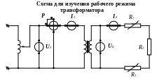 Вращая ручки переменных резисторов R2 и R3, провести не менее шести опытов, доведя ток первичной обмотки до 1 А. Первый опыт выпляется при I2 = 0, т.е. при разомкнутой цепи нагрузки (отключить один из резисторов R1, R2, R3).