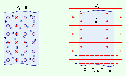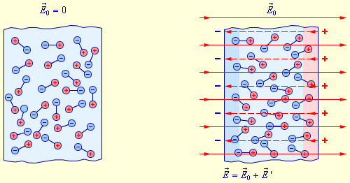 Вещество, внесенное в электрическое поле, может существенно изменить его. Это связано с тем, что вещество состоит из заряженных частиц. В отсутствие внешнего поля частицы распределяются внутри вещества так, что создаваемое ими электрическое поле в среднем по объемам, включающим большое число атомов или молекул, равно нулю. При наличии внешнего поля происходит перераспределение заряженных частиц, и в веществе возникает собственное электрическое поле. Полное электрическое поле складывается в соответствии с принципом суперпозиции из внешнего поля и внутреннего поля, создаваемого заряженными частицами вещества.