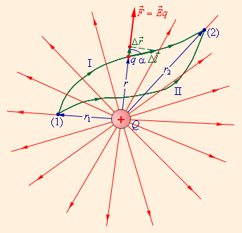 Работа сил электростатического поля при перемещении заряда из одной точки поля в другую не зависит от формы траектории, а определяется только положением начальной и конечной точек и величиной заряда.