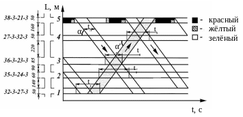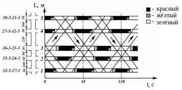 Таким образом, взаимное расположение на горизонтали полученного графика точек, соответствующих началу зелёных сигналов, определяет названные сдвиги фаз.