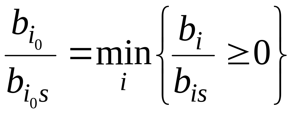 2) для выбора разрешающей строки находим МНО, используя процедуру выполнения п. 3 правила выбора разрешающего элемента при поиске опорного решения (при поиске оптимального решения, в отличие от поиска опорного, МНО может не существовать, если в s-м столбце не оказалось положительных элементов — это означает неограниченность сверху функции цели Z). Пусть МНО достигается при , т.е.