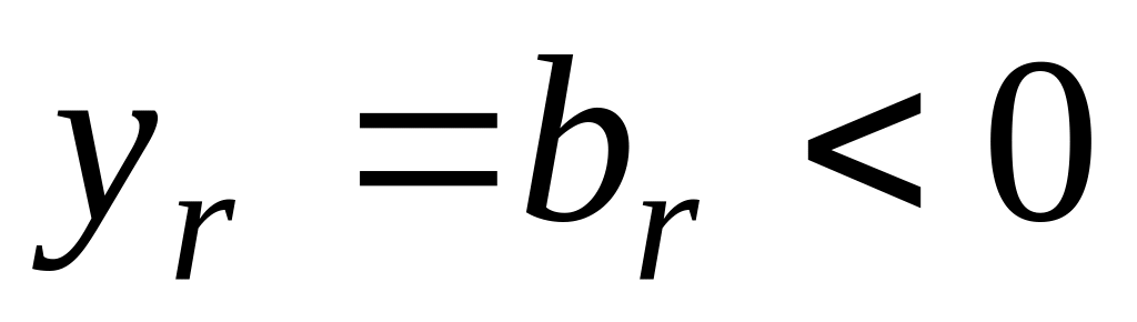 Если же разрешающий элемент не попал в r-ю строку, то новый (свободный член в r-й строке после МЖИ) останется еще отрицательным, но уменьшится по модулю. В этом случае продолжаем работать с r-й строкой (делать МЖИ, выбирая разрешающий элемент по изложенному правилу), и либо станет неотрицательным, либо установим несовместность системы ограничений.