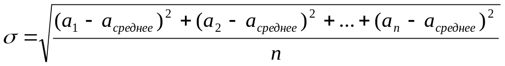 Средним квадратичным отклонением называется квадратный корень, из ср. ар. всех квадратов разностей между данными числами и их ср. ар. Ср кв. отклонение принято обозначать греческой буквой  («сигма»);