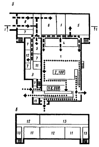 а- план на отм. 2,100; б - план на отм. 2,100; в - план на отм. 5,400; 1 -торговый зал; 2 - кафетерий (отдел кулинарии); 3 - отдел заказов; 4 - кладовые,используемые для, расширения торгового зала; 5 - кладовые; 6 - охлаждаемыекамеры; 7 - подсобные помещения; 8 - помещения для разгрузки и погрузки; 9-платформы для разгрузки и погрузки; 10 - прием стеклотары; 11 - техническиепомещения; 12 - служебные помещения; 13 - бытовые помещения