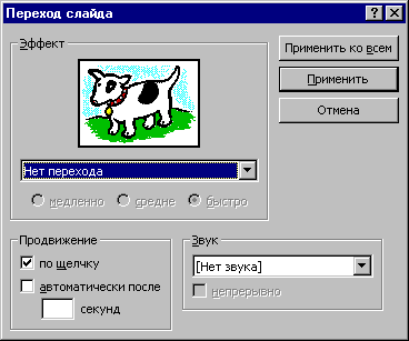 Рис. 1. Настройка перехода слайда при демонстрации