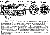 Центробежный распыл основан на том, что топливо I контура по каналу 10 форсунки поступает к переходнику 5 и по внутреннему ряду наклонных отверстий к распылителю I контура 4. В вихревую камеру этого распылителя топливо вводится через два тангенциальных паза 12, которые сообщают потоку вращательное движение с большой угловой скоростью. При выходе струи из сопла распылителя 4 действие центростремительных сил со стороны стенок прекращается и частицы топлива разлетаются по прямолинейным лучам, образующим полный конус с углом распыла при вершине.уВ центральном отверстии сопла распылителя 4 сохраняется давление воздуха в жаровой трубе камеры сгорания, поэтому истечение топлива из сопла происходит через кольцевое сечение в виде пелены. Пелена неустойчива к воздействию слабых возмущений, которые вызывают появление продольных и поперечных волн. С гребней волн срываются мельчайшие капельки, а затем вся пелена рассыпается на капли различного диаметра. Движущиеся капли в свою очередь дробятся под действием аэродинамических сил, так как они преодолевают силы, поверхностного натяжения. В конечном итоге образуется рой капель, который хорошо внедряется в воздушный поток, испаряется и образует свежую топливно-воздушную смесь.