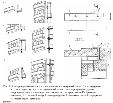 Плиту балкона проектируют как консольную или балочную с различным опиранием в зависимости от конструкции наружных стен дома и его конструктивной системы, рис. 1. Консольная плита передает на конструкции здания вертикальную реакции и опорный изгибающий момент. Восприятие этих усилий осуществляют различно в зависимости от строительной и конструктивной системы здания.
