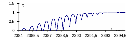 Физическое представление поглощения состоит в том, что при прохождении оптического излучения через газовую кювету молекулы газа, поглощая кванты излучения, соответствующие определенным частотам, возбуждаются, т. е. увеличивают запас своей энергии. Если поглощается ультрафиолетовое и видимое излучение или излучение коротковолновой части инфракрасного спектра, то повышается запас энергии электронов, энергии, соответствующей колебанию ядер атомов, и энергии вращения молекулы вокруг центра тяжести. Если поглощаются кванты, соответствующие более длинноволновой области спектра оптического излучения (от нескольких микрометров до сотен микрометров), то возбуждаются колебательно-вращательные и, соответственно, чисто вращательные степени свободы. В результате этого спектры поглощения молекул состоят из ряда полос, имеющих весьма сложную структуру. На рисунок 112 показана часть спектра, снятого при толщине слоя газа 100 мм, давлении 10000 ppm и температуре 20 0С. Хорошо видны полосы колебательно-вращательного спектра поглощения углекислого газа.