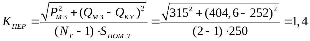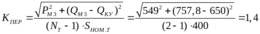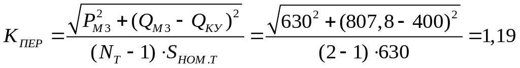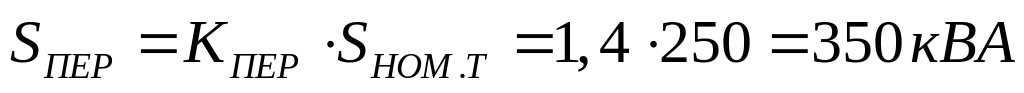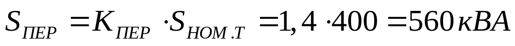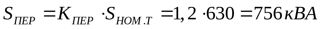 Расчет производим для послеаварийного режима (в случае выхода одного из трансформаторов). Допустимый коэффициент перегрузки для трансформаторов, заполненных жидким диэлектриком принимают как для масляных следовательно в послеаварийном режиме оставшийся в работе трансформатор сможет передать мощность: