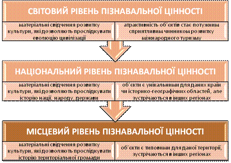 Суспільні туристичні ресурси - матеріальні об'єкти, що несуть семантичну та естетичну інформацію і можуть використовуватися в екскурсійно-туристичній діяльності для задоволення специфічних соціальних і рекреаційних потреб особистості. Суспільні ресурси мають різну пізнавальну та естетичну цінність, а тому поділяються на кілька рівнів: місцевий, національний або державний і міжнаціональний або світовий (рис. 1.6).