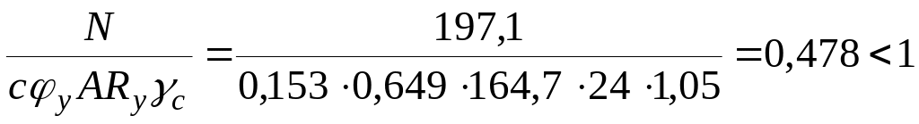 где N – продольное усилие, приложенное с эксцентриситетом e; γс=1,05 – коэффициент условий работы для колонн одноэтажных производственных зданий с мостовыми кранами, определяемый по табл. 1 [6]; φе - коэффициент устойчивости, принимаемый по табл. Д.3 [6] в зависимости от условной гибкости стержня