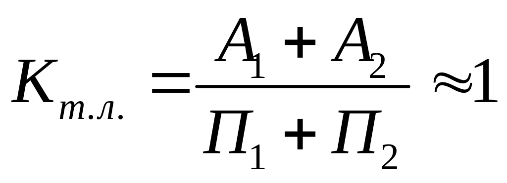 Показывает насколько в целом активы покрывают обязательства. Примерное значение этого показателя равно 2, потому что при закрытии предприятия активы примерно продаются в половину от балансовой стоимости. Он также характеризует самостоятельность предприятия. Комиссия по банкротству обращает внимание на этот показатель.