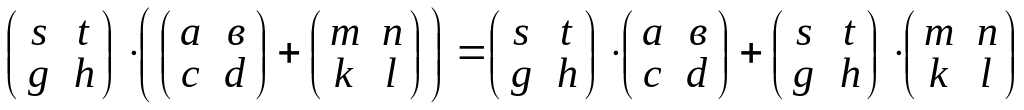 6) умножение матриц дистрибутивно относительно сложения, т.е. справедливы равенства: