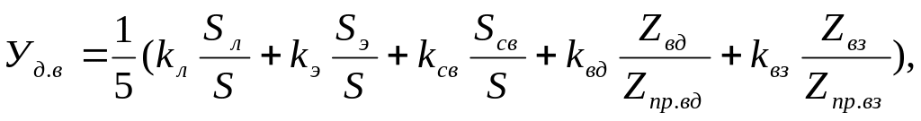 де S – площа території, використовувана підприємством; Sл – площа ушкоджень ландшафту; Sэ – площа енергетично забрудненої території; Sсв – площа, зайнята під смітники; Zвд – фактична концентрація забруднюючих речовин у воді; Zпр.вд - гранично допустима концентрація забруднювальних речовин у воді; Zвз - фактична концентрація забруднювальних речовин у повітрі; Zпр.вз - гранично допустима концентрація забруднювальних речовин у повітрі; kл – коефіцієнт, що враховує ступінь пошкодження ландшафту; kэ – коефіцієнт, що враховує інтенсивність енергетичного забруднення; kсв – коефіцієнт, що враховує небезпеку речовин у відходах; kвд – коефіцієнт, що враховує небезпеку речовин у воді; kвз – коефіцієнт, що враховує небезпеку речовин у повітрі.