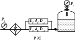9.5. Визначити при рівні Н=4м і тиску в ресивері Р1=2атм показання манометра, установленого за теплообмінником 1 і виконаним з мідних трубок d1=20мм; довжиною L1=2м; 1=20, при витраті води G, якщо відомо, що сталеві, помірно заржавлені труби на ділянках 1 і 2 мають довжину L2=L3=20м;.