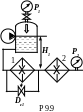 9.7. Рідина з мережі по чавунному водоводу діаметром 50 мм, довжиною 200м з витратою G через вентиль 1 і паралельно з'єднані теплообмінник і нагрівач надходить у бак. Визначити, який рівень Н установиться в баку, якщо Р1=3атм, характеристика теплообмінника описується виразом H=N·(G3)2, де H=[м]; G3=[кг/с].