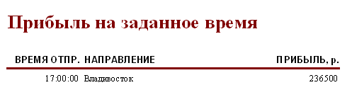 Для получения отчета о прибыли на заданное время нужно выбрать время отправления рейса из предоставленного списка и нажать кнопку «ПРИБЫЛЬ НА ВРЕМЯ»: